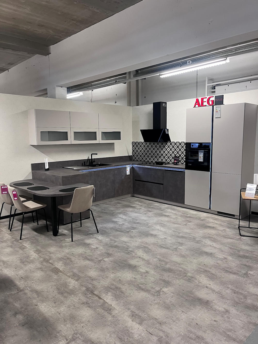 Modell AB47 - Schaffen Sie sich eine heimelige Küchenatmosphäre mit dieser trendigen Küche. Die hohen Fronttüren sorgen dafür, dass immer alles ordnungsgemäß aufgeräumt ist - eine optimale Küche für Ihr Mansardenzimmer. Besonders entspannend ist die neue Trendfarbe greige - ein moderner und trotzdem neutraler Look, perfekt abgerundet mit den schwarzen Griffe, die der Küche nochmal das elegante Etwas verleihen.